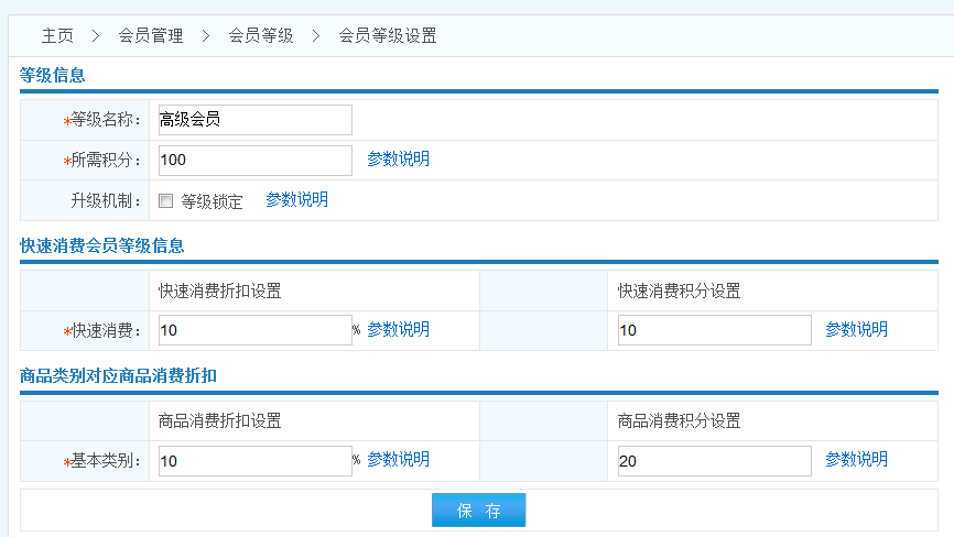 商品類別對(duì)應(yīng)商品消費(fèi)折扣:基本分類:會(huì)員在此等級(jí)時(shí),商品消費(fèi)所能享受的消費(fèi)折扣 積分:會(huì)員在此等級(jí)時(shí),商品消費(fèi)時(shí)自動(dòng)兌換的積分比率,如:消費(fèi)10元得1積分|消費(fèi)20元得1積分|消費(fèi)50元得1積分。