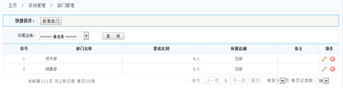 查看員工部門列表: 1.新增部門:添加新的部門 (見下圖) 2.查詢:可以根據(jù)店鋪的名稱 查詢該店鋪內(nèi)的一些部門(默認(rèn)查詢的是當(dāng)前店鋪的子部門) 3.部門列表:在列表中的操作一欄 可以對該部門進(jìn)行編輯或者是刪除
