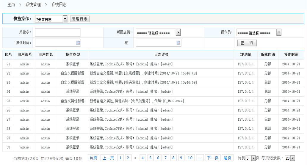 2.查詢?nèi)罩荆焊鶕?jù)條件查詢數(shù)據(jù)(關(guān)鍵詞、時間段、按店鋪、按操作員)